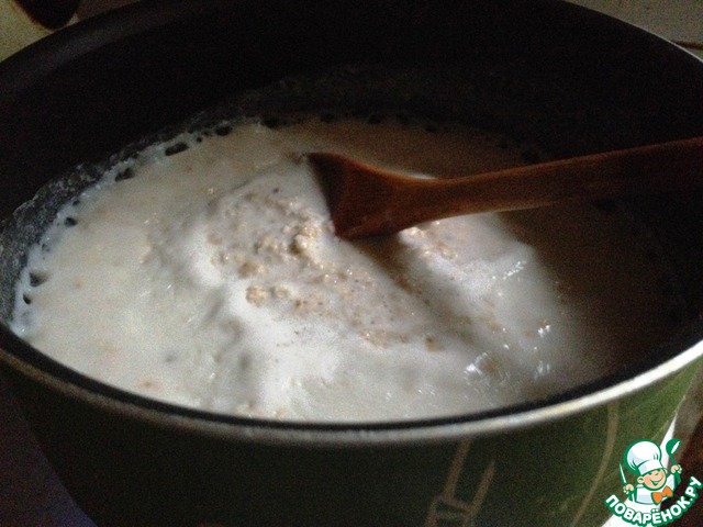 Молоко довести до кипения, посолить, всыпать овсяные хлопья. Варить, помешивая, на слабом огне примерно 6 минут.