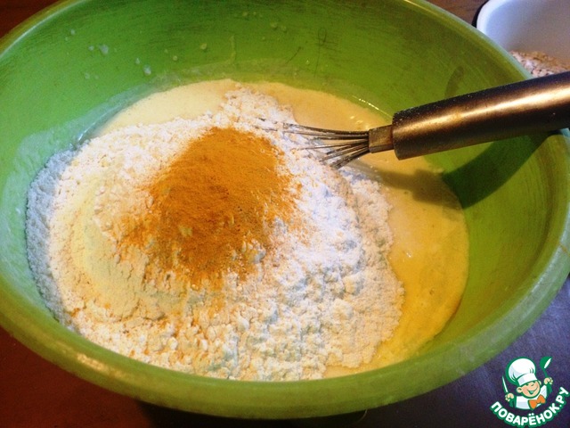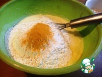 Добавить сметану, растительное масло. Взбить. Ввести муку, разрыхлитель теста, имбирь, куркуму. |
