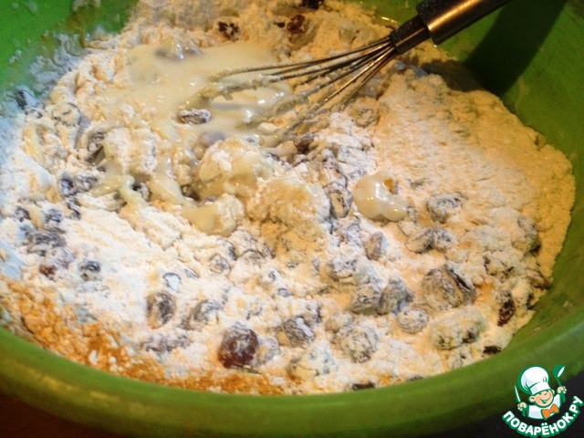 Добавить изюм, смешанный с мукой. Замесить тесто. |