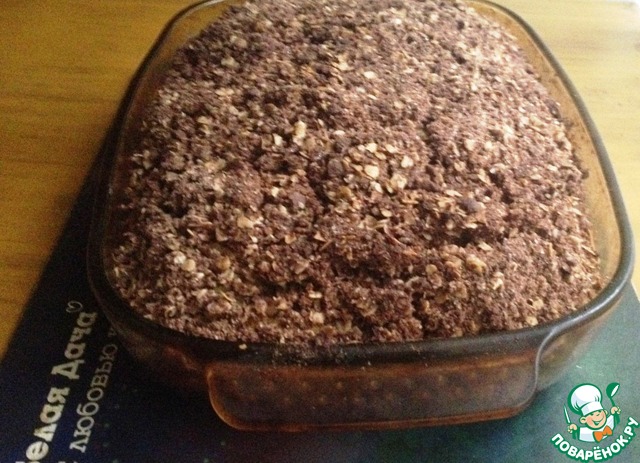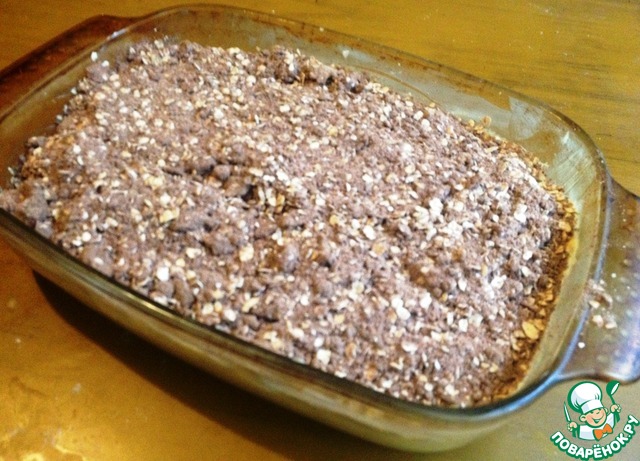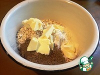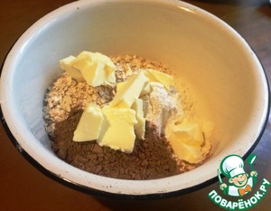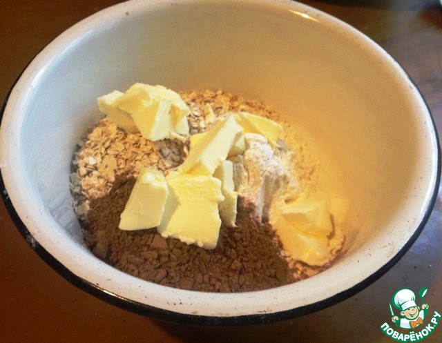 В миску выложить муку, сахар, овсяные хлопья, какао. Добавить сливочное масло, нарезанное кусочками и перетереть в крошку. |