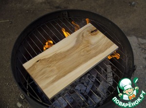 После того как температура углей достигла оптимальной температуры положите гриль-доску на решетку гриля, над углями, лицевой стороной вниз. В таком положении продержите доску 1-2 минуты, пока не пойдет дым (подсушенная лицевая сторона не позволит гриль-доске чрезмерно выгибаться во время запекания).