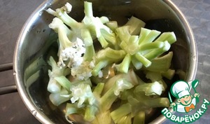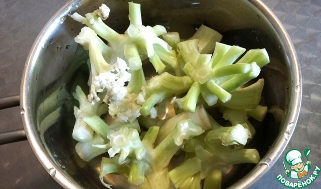 Для запеканки я использовала мелкие соцветья цветной капусты, а вот кочерыжечки остались. И решила я пустить их в дело. Для начала отварила их в подсоленой воде 10 минут. Слила бульон в отдельную чашку и оставила капусту немного подостыть.
