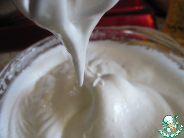 Я взбивала ручным миксером. Взбиваем на высоких оборотах. Как только белки изменят цвет (побелеют), начинаем порциями добавлять сахар. Каждую новую порцию добавляем через 15-20 секунд после предыдущей. Очень важно: белки не перебиваем. Белок должен держаться на венчике полоской, которая не спадает и не течет, но, если венчиком пошевелить, то белок качается, как маятник. -