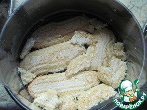 Кольцо диаметром 20 сантиметров затянуть пленкой, поставить на доску, бока выложить кондитерской лентой или файликом. Можно взять разъемную форму. Уложить печенье.