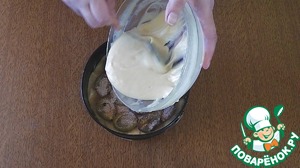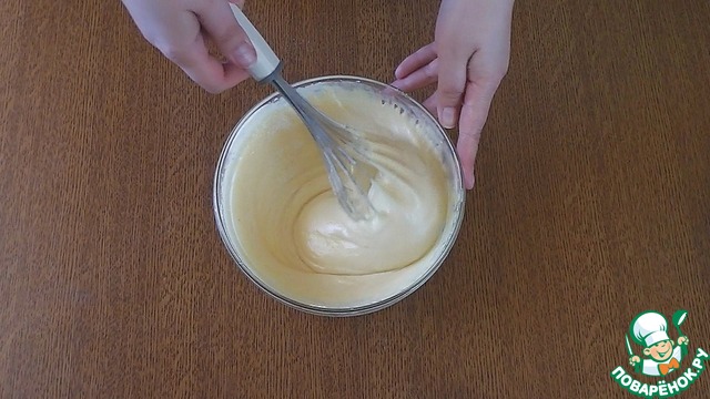 Перемешать венчиком яйца, соль, сахар (примерно 1 ст. л оставить), ванильный сахар. Помешивая влить молоко, затем растопленное масло. Добавить муку и разрыхлитель, размешать.