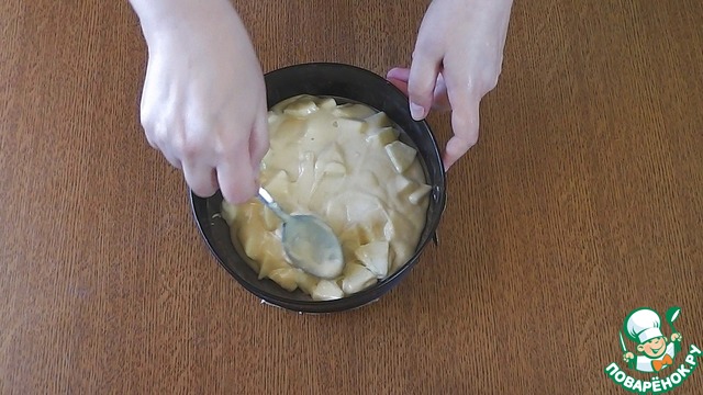 Тесто поделить на 2 части. В одну добавить порезанные яблоки. И выложить это тесто в форму, дно которой покрыто пергаментом (смазать маслом). У меня форма d=21см.