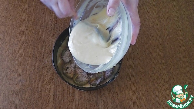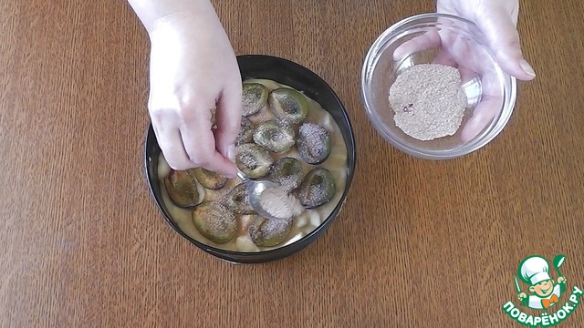 Сверху выложить половинки слив. Оставшийся сахар перемешать с корицей, кардамоном и перцем. Посыпать этой смесью сливы.