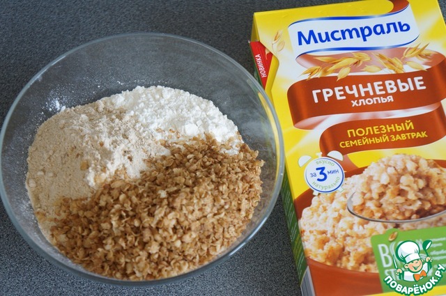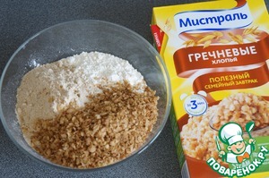 Смешайте сухие ингредиенты: оба вида муки, сахар, соль, разрыхлитель, соду, ванилин. Добавьте гречневые хлопья от Мистраль.
