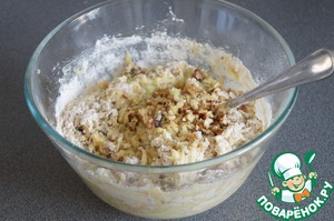 Соедените обе смеси, всыпьте нарезанные сухофрукты, изюм или орехи.