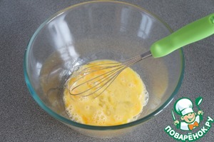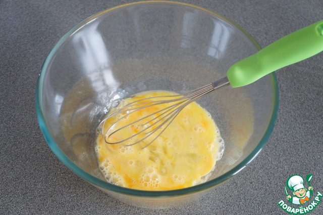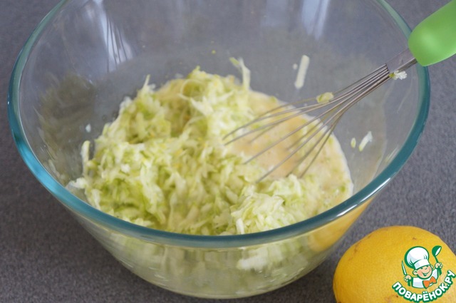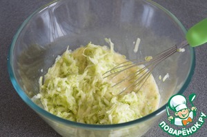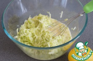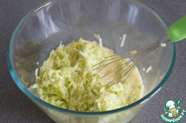 ДОбавьте к яйцам натёртый кабачок. По объёму должно быть 2 стакана кабачков (сок слегка отжать).