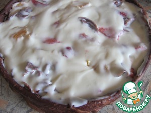 Укладываем мешочки в форму сверху на крем и слегка утапливаем. Так поступаем со всеми блинами, оставив один.
