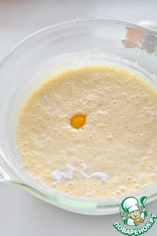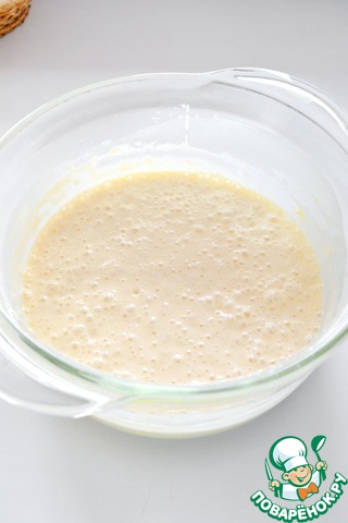 В теплую (35-36 градусов) сыворотку добавьте немного пшеничной муки, чтобы получилось жидкое тесто, всыпьте дрожжи, щепотку сахара. Оставьте опару на 15-20 минут пока она не запузырится