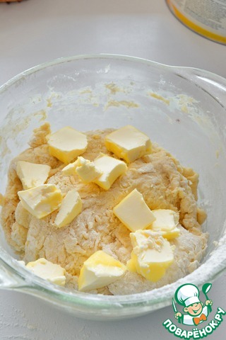Мягкое сливочное масло порежьте кусочками и вмешайте в тесто. Сначала тесто будет очень липким, но через 5-7 минут станет нежным и эластичным