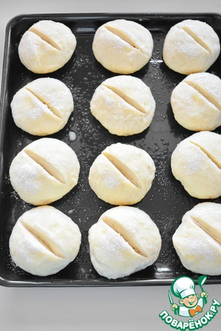 Каждый шарик обмакните в сахар и поместите булочки на противень. При желании сделайте надрез ножом. Дайте им подняться 20 минут