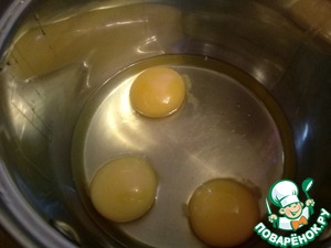 Для теста. Взбить яйца, постепенно вводим сгущенку, взбить. Постепенно добавляем просеянную муку и гашеную соду, хорошо все взбиваем.