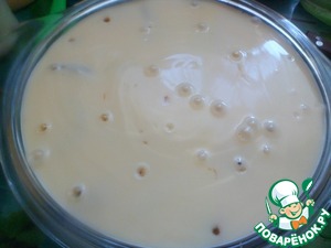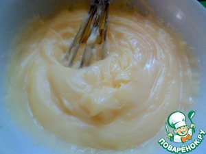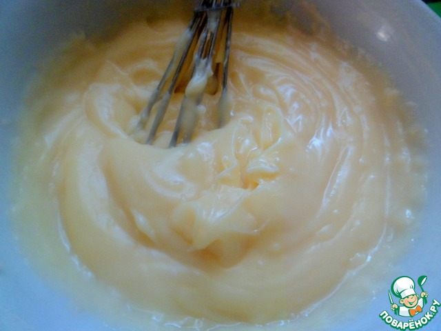 Приготовить крем: соединить слегка взбитые вилкой яйца, сахар, крахмал. Затем вливать медленно теплое или холодное молоко и хорошо размешивать.