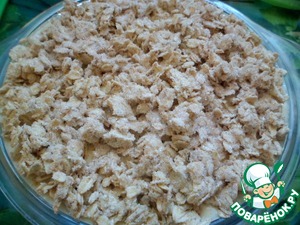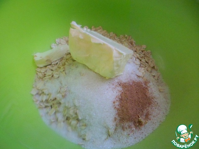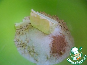 Для хрустящего теста, смешать овсяные хлопья экстра ТМ Мистраль с сахаром, корицей и мягким сливочным маслом комнатной температуры.