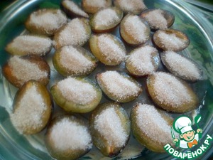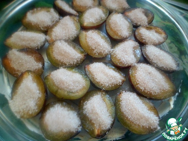 Из слив вынуть косточки. Смазать дно формы (в которой будем подавать на стол), сливочным маслом и разложить в один слой сливы, разрезом к верху. Смешать сахар с корицей и разложить его на каждую половинку сливы. Отставить.