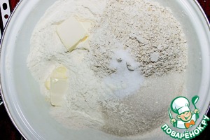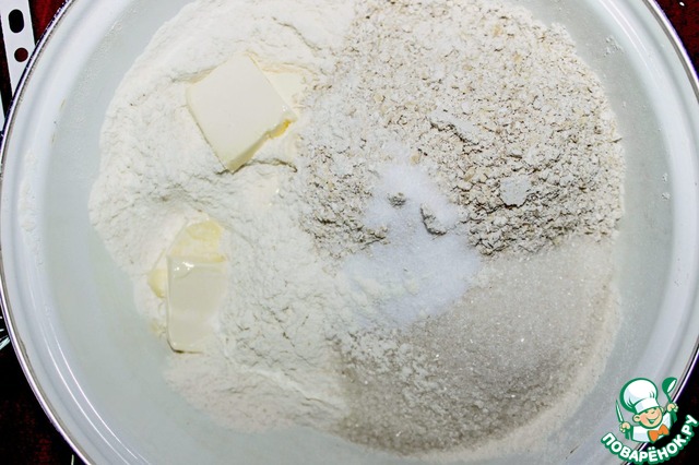 В глубокую миску просеиваем муку, добавляем измельченные овсяные хлопья, сахар, соль и размягченное масло и растираем в крошку.