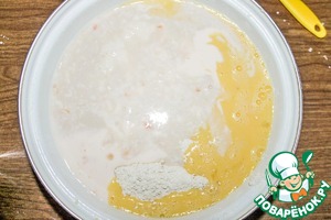 В теплой воде растворить 1 ст. л сахара (взять из общего количества сахара) и дрожжи. Отставить в сторону.