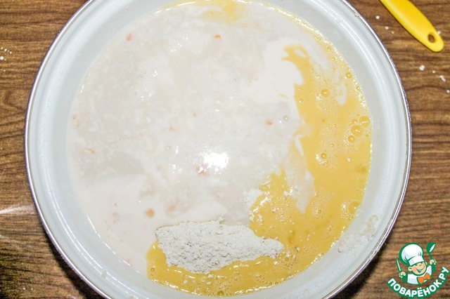 В мучную смесь добавляем яйца, йогурт и дрожжи. Хорошенько вымешиваем.