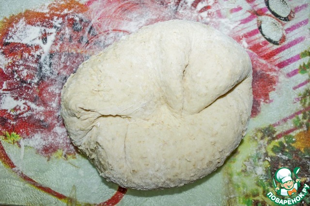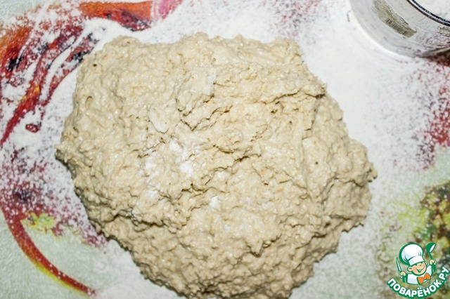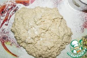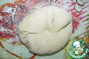 Вымешанное тесто выкладываем на подпыленную мукой доску и тщательно месим, пока тесто не перестанет липнуть к рукам.