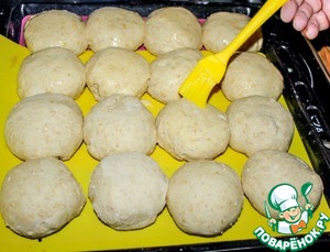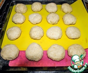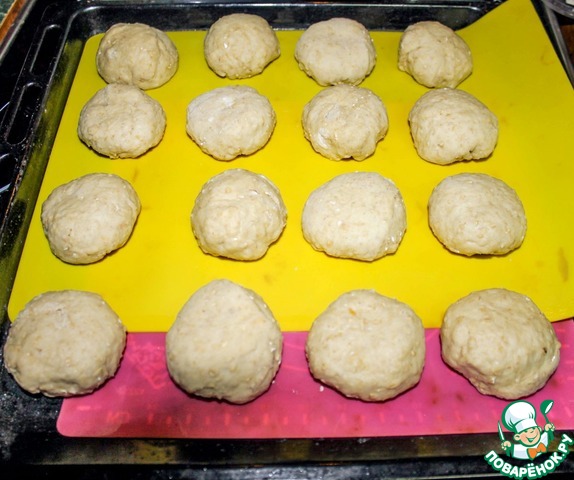 Из теста формуем шарики и выкладываем на застеленный пергаментом или силиконовым ковриком противень. У убираем в тепло на 30 минут для расстойки. Проще делать это в духовке, нагретой до 60 градусов.