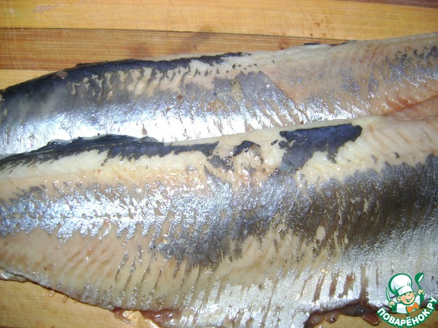 Селёдку разделываем на филе, удалив косточки.