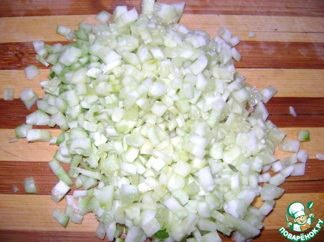 Нарезаем огурцы мелким кубиком.