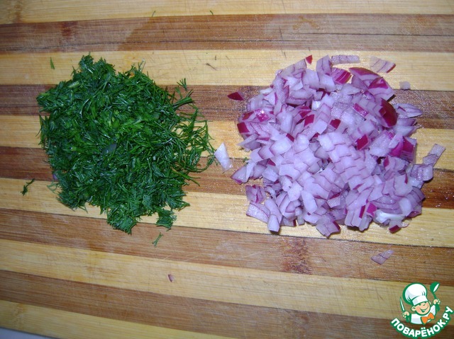 Измельчаем лук и укроп.