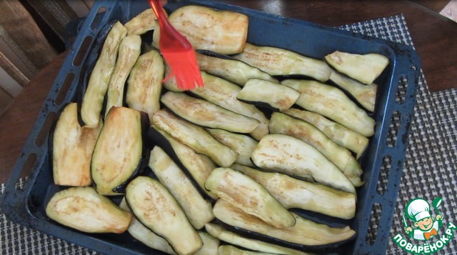 Когда баклажаны пустили сок, отжимаем их и выкладываем на смазанный маслом противень. Запекаем в духовке при 220 градусах до золотистого цвета.