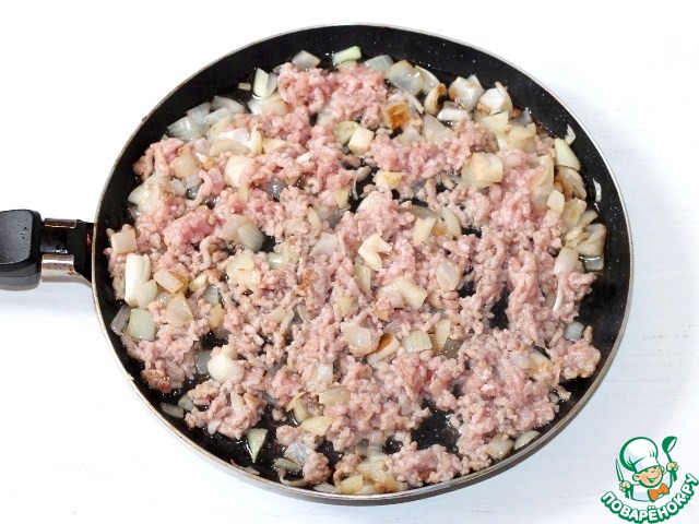 2. Мясной фарш обжариваем на растительном масле (1 ст. л.) с репчатым луком до "бела".