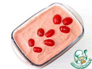 7. Выкладываем томатную смесь сверху в лоток, разравниваем и украшаем половинками помидоров черри.