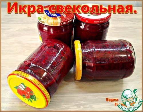 Добавить свеклу и уксус, поварить еще 10-15 минут. Готовую икру разложить в банки и закатать.