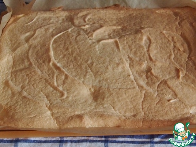 Готовый бисквит снять вместе с бумагой с противня на стол так, чтобы он располагался более длинной стороной ближе к вам.