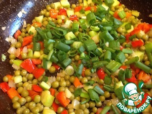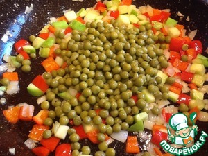 Сверху добавим зеленый горошек. Размешаем и обжарим 1 минутку.