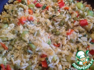 Выливаем к рису и овощам, перемешиваем, чтобы яйца распределились однородно.