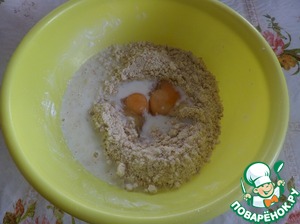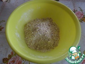 Пока обжаривается капуста, готовим тесто для пирога. В чашку просеиваем муку. Добавляем сливочное масло, соль, сахар, разрыхлитель. Отмеряем необходимое количество овсяных хлопьев.