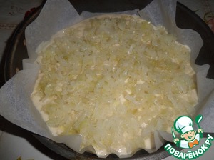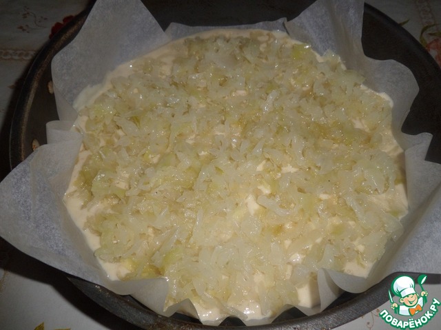 В форму, застеленную пергаментом, выливаем половину теста. Диаметр формы = 20 см.