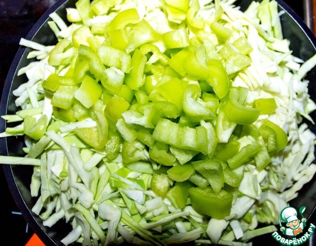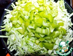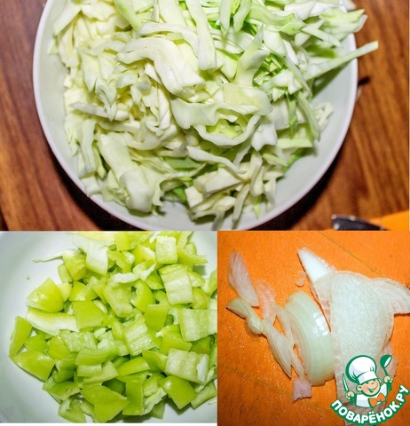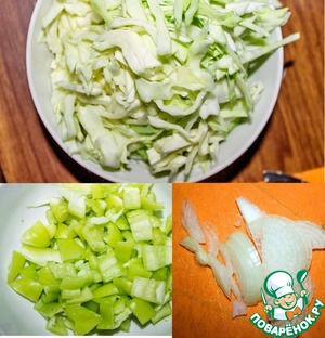 Капусту нашинковать, перец болгарский нарезать кубиками, лук нарезать полукольцами.