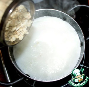 В закипевшее молоко добавляем щепотку соли, хлопья, размешиваем.
