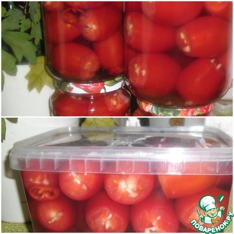 Помидоры, которые уже много лет готовят в нашей семье. Рецепт кто-то дал моей тетушке, она передала мне. Когда она в первый раз угостила нас этими помидорами, мы с сестрой просто влюбились в них, теперь готовлю сама. Банка помидоров улетает за минуту. Рассол тоже не советую выливать - его можно использовать в качестве приправы, например, при тушении мяса (я правда ни разу не пробовала, потому что рассол выпивается еще до того, как закончились помидоры, очень уж вкусный ;-) Преимущество этого рецепта в том, что он не зависит от "сезонности" - можно купить помидоры в середине ноября и на Новый Год порадовать своих близких вкуснейшей закуской.