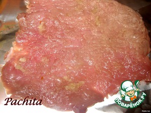На квадрат фольги выложить мясо,смазать пропущенным через пресс чесноком, посолить.