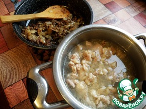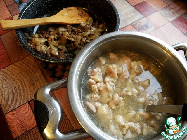 - Мясо (жирная мясная обрезь, можно пополам свинину и курицу) — 300 г
