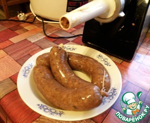 Кишки – у меня соленые- промыть от соли и замочить минут на 10 в теплой воде. Натянуть кишку на цевку мясорубки, завязав прочно один конец. Набить колбасу, завязать второй конец и перекрутить через каждые 15 см на отдельные колбаски. Сделать по два-три прокола на батончик тонкой иголкой.
