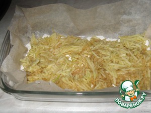 В форму высыпаем часть нашего "теста", сверху два тертых яблока. Опять повторяем эту процедуру.
