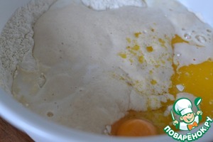В большой миске смешать всю муку, соль, растопленное масло, яйцо и оставшееся молоко. Влить готовые дрожжи.