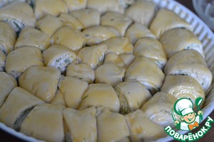 Выкладываем каждый кусочек в форму по кругу, обращая к краю то широкую, то узкую часть сегмента.