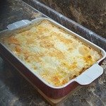 12. В смазанную маслом форму выкладываем сначало рагу с фаршем, затем соус Бешамель и тёртый Пармезан, накрываем сверху пластинами из теста.