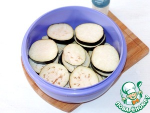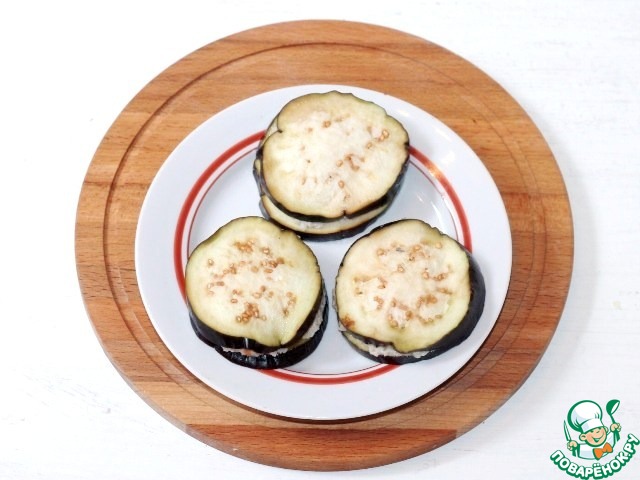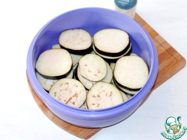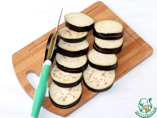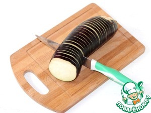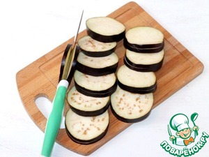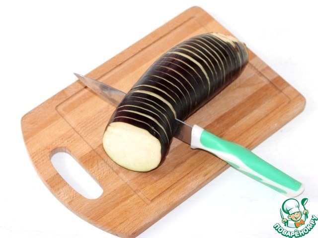1. Подготовим баклажаны. Баклажаны нарезаем гармошкой, толщиной 5 мм. Нарезаем кружочки не до конца баклажана. Ломтики должны держаться вместе.